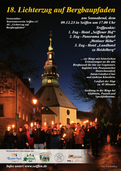 Glück Auf, liebe Reiseliebhaber und Freunde des traditionellen Brauchtums, wenn die kühlen Winde des Dezembers durch die Straßen wehen und die Sterne besonders hell funkeln, wird Seiffen zum Ort des Lichterzaubers. Es freut mich sehr, euch zum 18. Lichterzug auf den Bergbaupfaden am 09. Dezember 2023 einzuladen. Beginnend um 17.00 Uhr, werden wir an drei verschiedenen Treffpunkten – Hotel „Seiffener Hof“, Panorama Berghotel „Wettiner Höhe“ und Hotel „Landhotel zu Heidelberg“ – zusammenkommen. Bei diesem besonderen Ereignis ziehen wir mit leuchtenden Fackeln durch die malerischen Straßen und Gassen von Seiffen. Der Weg führt uns zur Binge, wo wir uns an historischen Erinnerungen an die alte Bergbauzeit bis…