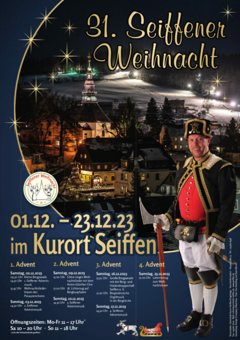 Weihnachten ist die Zeit der Besinnung, des Glanzes und der festlichen Stimmung. Dieses Jahr lädt der Kurort Seiffen wieder zu seiner traditionellen Seiffener Weihnacht ein. Es ist bereits die 31. Auflage dieses bezaubernden Festes, das von 01. Dezember bis zum 23. Dezember 2023 stattfindet. Während dieser besonderen Tage wird Seiffen zu einem wahren Winterwunderland. Mit jedem Advent wird eine besondere Feierlichkeit geboten. Vom Chorgesang, über traditionelle Erzgebirgsmusik bis hin zu beeindruckenden Läuterzügen – in Seiffen wird die Vorweihnachtszeit zu einem unvergesslichen Erlebnis. Die festlichen Öffnungszeiten bieten den Besuchern ausreichend Gelegenheit, die magische Atmosphäre aufzusaugen. Von Montag bis Freitag sind die Tore von 11 bis 17 Uhr…